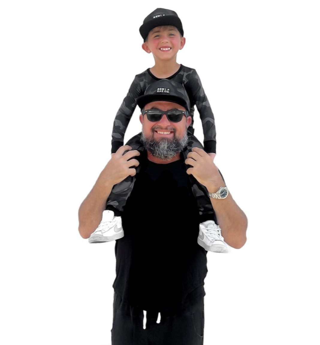 A Remi + Rae Co. EXCLUSIVE Black Camo Pattern. The letters, "RRCO" and "RUDI" are hidden in the pattern to form our exclusive camo. In honor of Rudi and every hero out there, this one is for you. Thank you for your humble sacrifice, service, and courage.