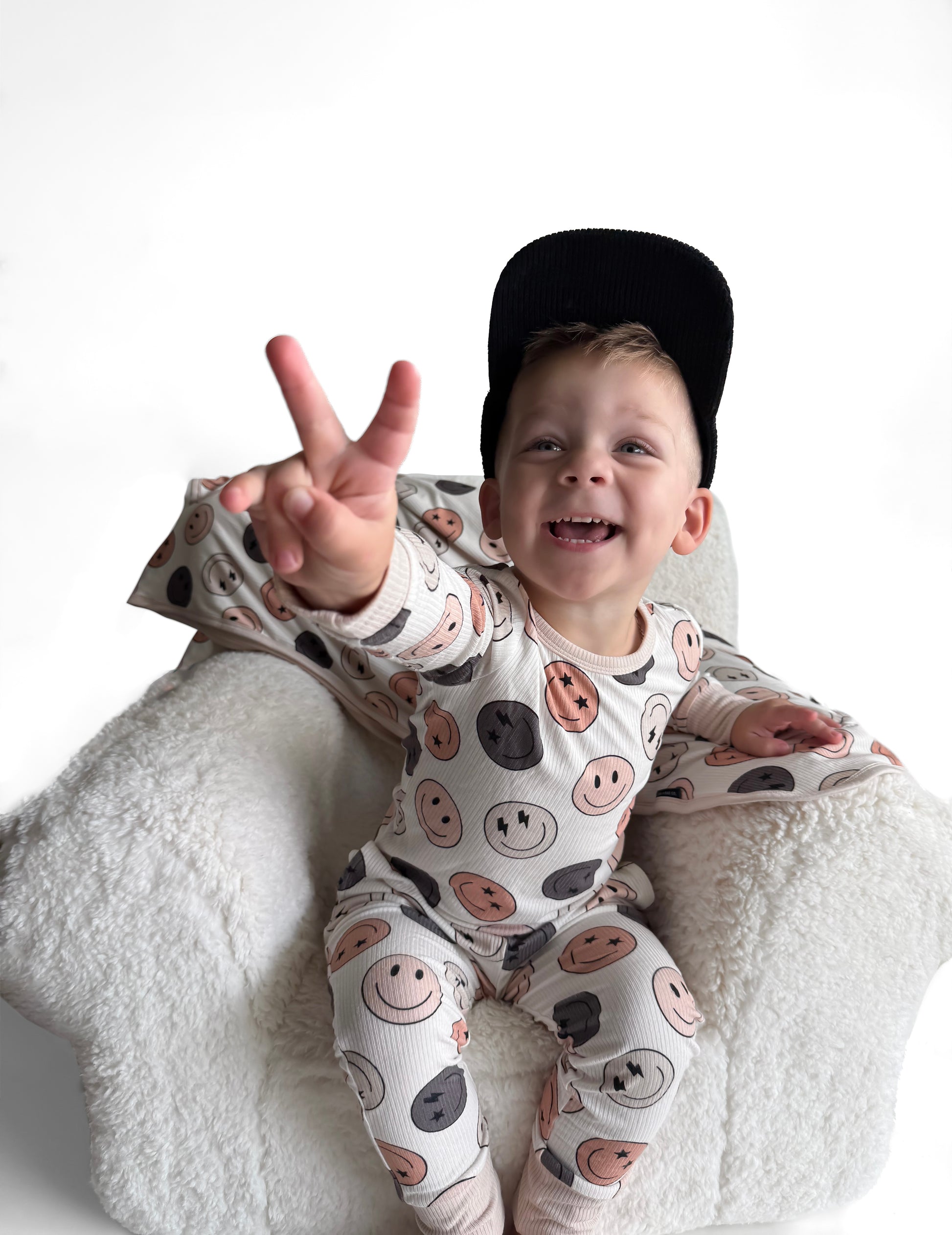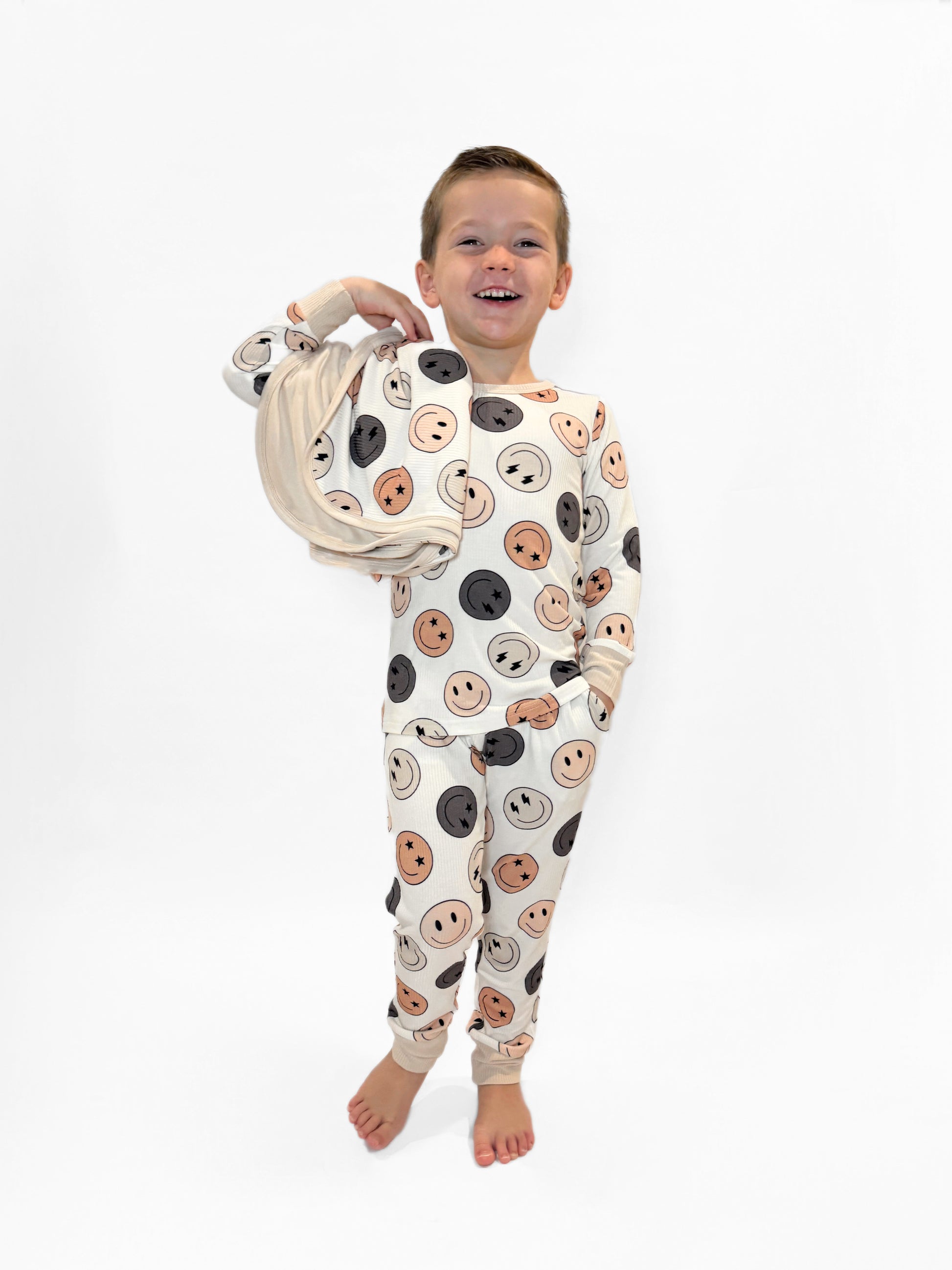 Wrap yourself in comfort + style with our Bamboo Ribbed Blanket, designed for every cozy moment. Featuring a one-sided smiley design, and a solid under side. With a trendy design, our blanket effortlessly complements any room or playroom decor.